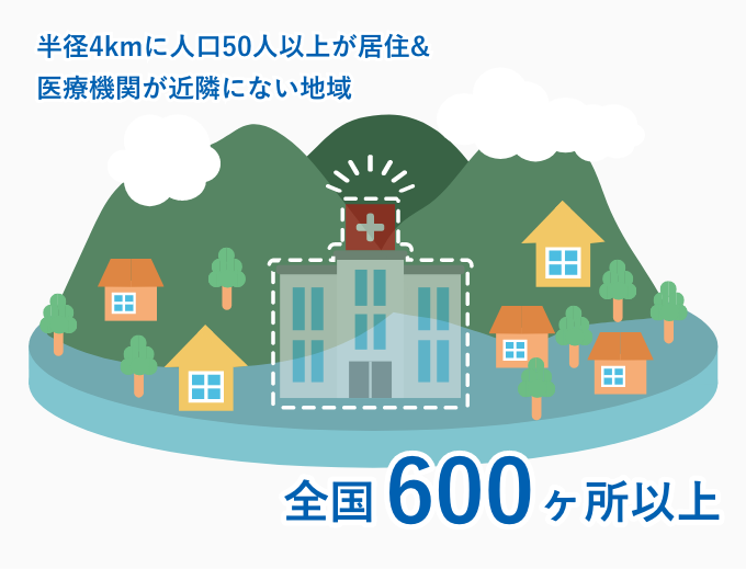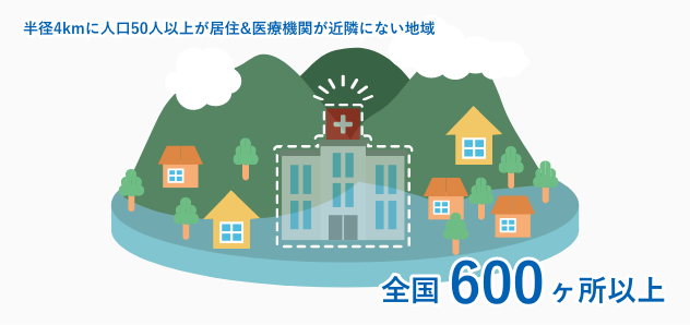 ここでいう「へき地」とは、「交通条件及び自然的、経済的、社会的条件に恵まれない山間地、離島その他の地域のうち医療の確保が困難であって無医地区及び無医地区に準じる地区の要件に該当する地域」とされ、2014年時点でへき地が存在しない千葉県、東京都、神奈川県、大阪府を除く43道府県の無医地区637か所と準無医地区420か所の合計1057か所が対象となっています。